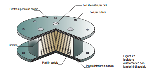 Gli isolatori in materiale elastomerico e acciaio (nella figura) sono costituiti da strati alterni di materiale elastomerico (di spessore variabile tra 8 mm e 20 mm) e di acciaio (spessore 2÷3 mm). I lamierini di acciaio vengono vulcanizzati negli strati di gomma e svolgono una funzione di confinamento dell’elastomero, riducendone la deformabilità per carichi ortogonali alla giacitura degli strati (carichi verticali) e lasciando inalterata la deformabilità per carichi paralleli alla giacitura degli strati (carichi orizzontali). Mediamente, si ottiene una rigidezza verticale dell’ordine di circa cento volte la rigidezza orizzontale. Gli accorciamenti subìti dal dispositivo per effetto del solo carico verticale di competenza sono, invece, di circa 1÷3 mm.