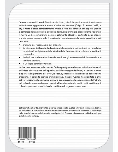 Questa nuova edizione di Direzione dei lavori pubblici e pratica amministrativa contabile di Salvatore Lombardo è aggiornata al nuovo Codice dei contratti (D.Lgs. 31 marzo 2023, n. 36).