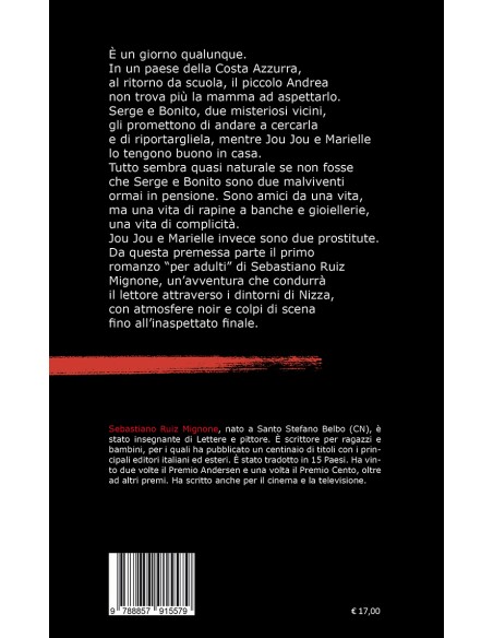 Questa ferita dove muore il mare rappresenta per Sebastiano Ruiz Mignone, penna versatile e gradevolissima tra le più celebri firme della letteratura italiana per ragazzi, un vero e proprio debutto nel campo del genere noir per un pubblico più adulto; un libro che condurrà il lettore attraverso i bassifondi di Nizza, con atmosfere noir e colpi di scena inaspettati.