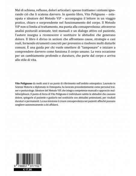 Il Metodo ViP non si limita al trattamento, ma punta alla consapevolezza: attraverso analisi posturali avanzate, test manuali e un dialogo attivo col paziente, l’autore insegna a riconoscere e sostituire le abitudini che generano dolore. Il libro è diviso in sezioni che affrontano cause, strategie e casi reali, fornendo strumenti concreti per prevenire e risolvere molti disturbi comuni. È una guida per chi vuole smettere di “tamponare” e iniziare a comprendere davvero come funziona il corpo umano. La vera occasione per un cambiamento profondo e duraturo, che parte dal corpo e arriva allo stile di vita.