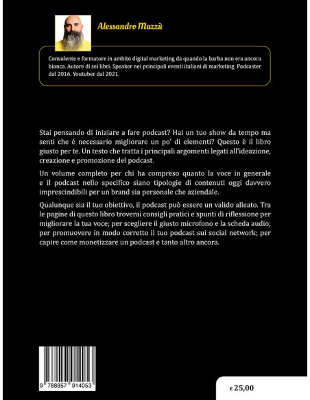 Tra le pagine di questo libro troverai consigli pratici e spunti di riflessione per migliorare la tua voce; per scegliere il giusto microfono e la scheda audio; per promuovere in modo corretto il tuo podcast sui social network; per capire come monetizzare un podcast e tanto altro ancora.